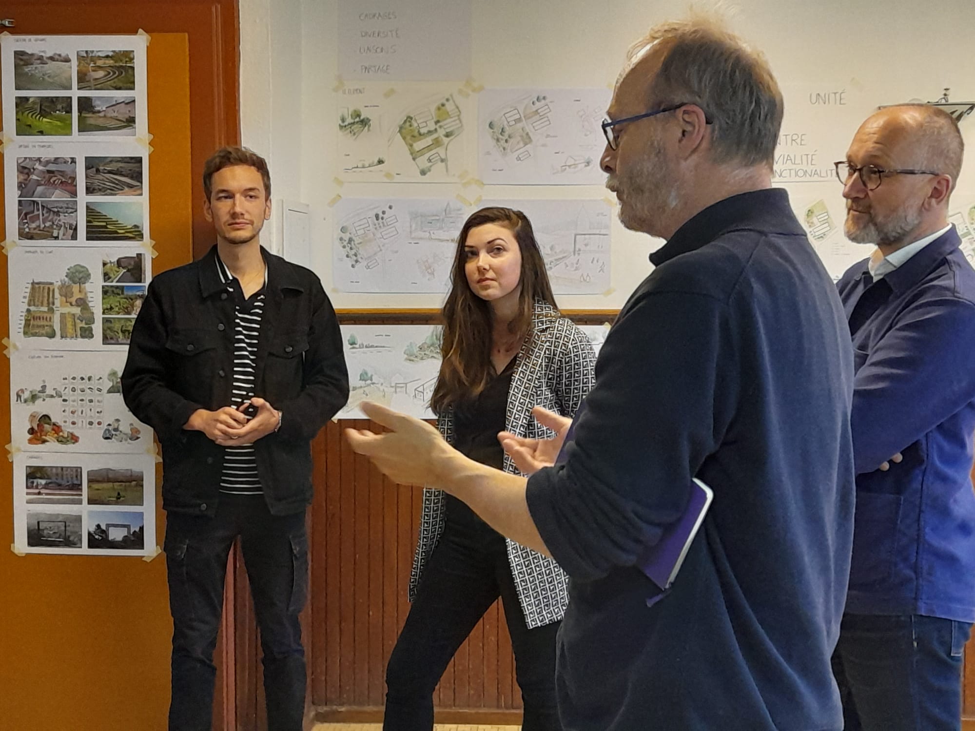 Ils sont montés deux fois au Climont, Thomas Kernin, Manon Léger et Léo Mercey, 3 étudiants en Master 1 de l’Ecole d’Architecture de Strasbourg (ENSAS) avec leur professeur, l’architecte Hervé Schneider pour imaginer le lieu « entre » les bâtiments de l’ancienne colonie et le temple. Comment transformer ce terrain de basket en un jardin où on peut cultiver des légumes, la rencontre et l’amitié? Comment relier les trois bâtiments qui, architecturalement, n’ont rien à voir les uns avec les autres? Comment apprivoiser la pente et descendre vers le temple sans perdre le goût du jeu…?
