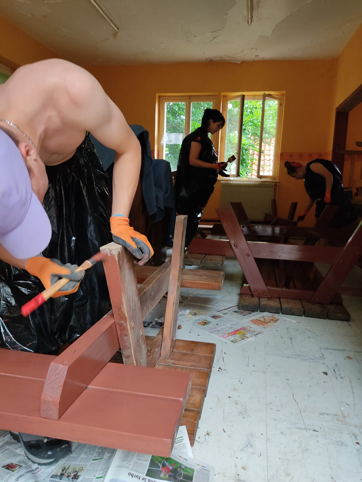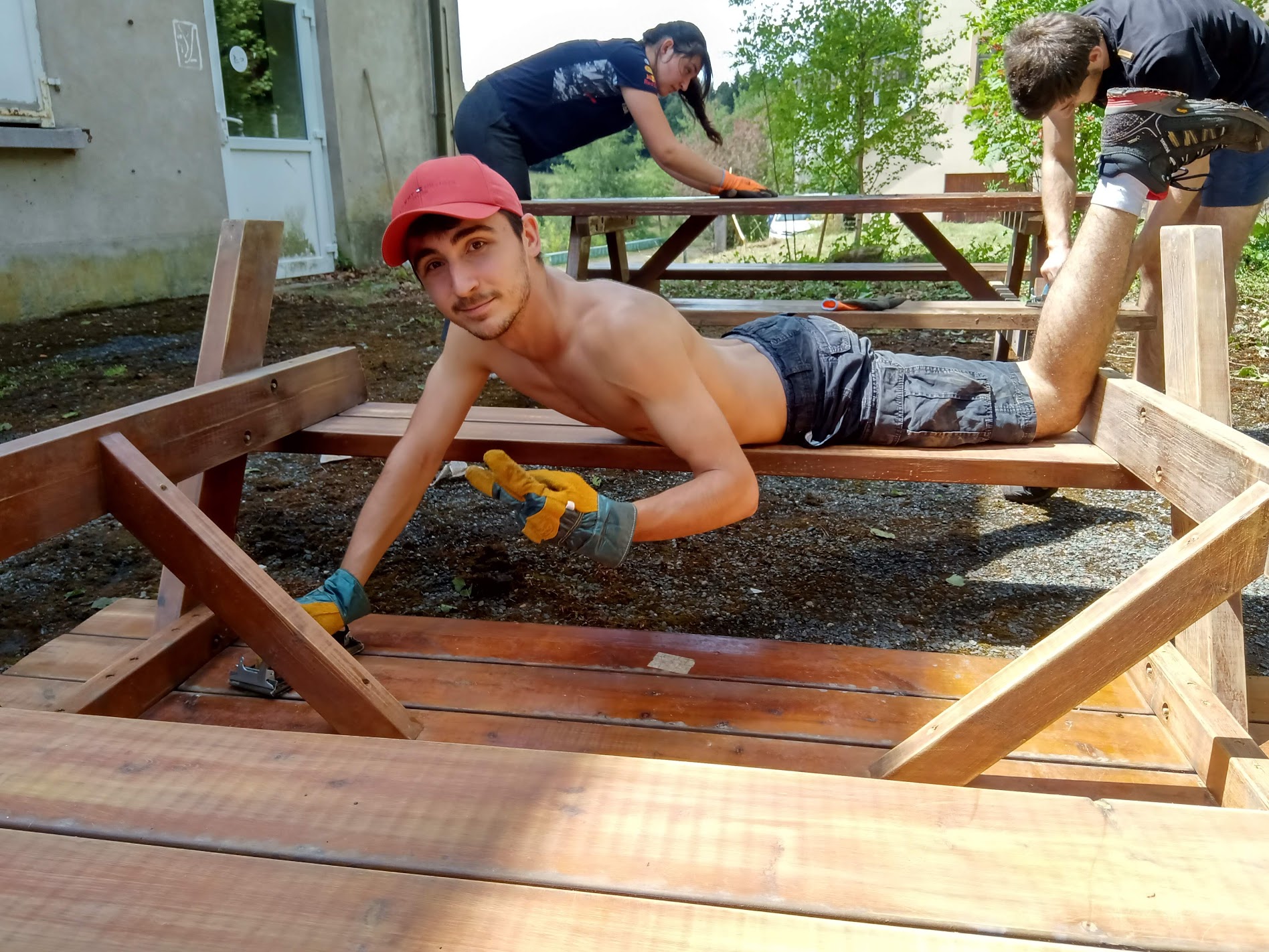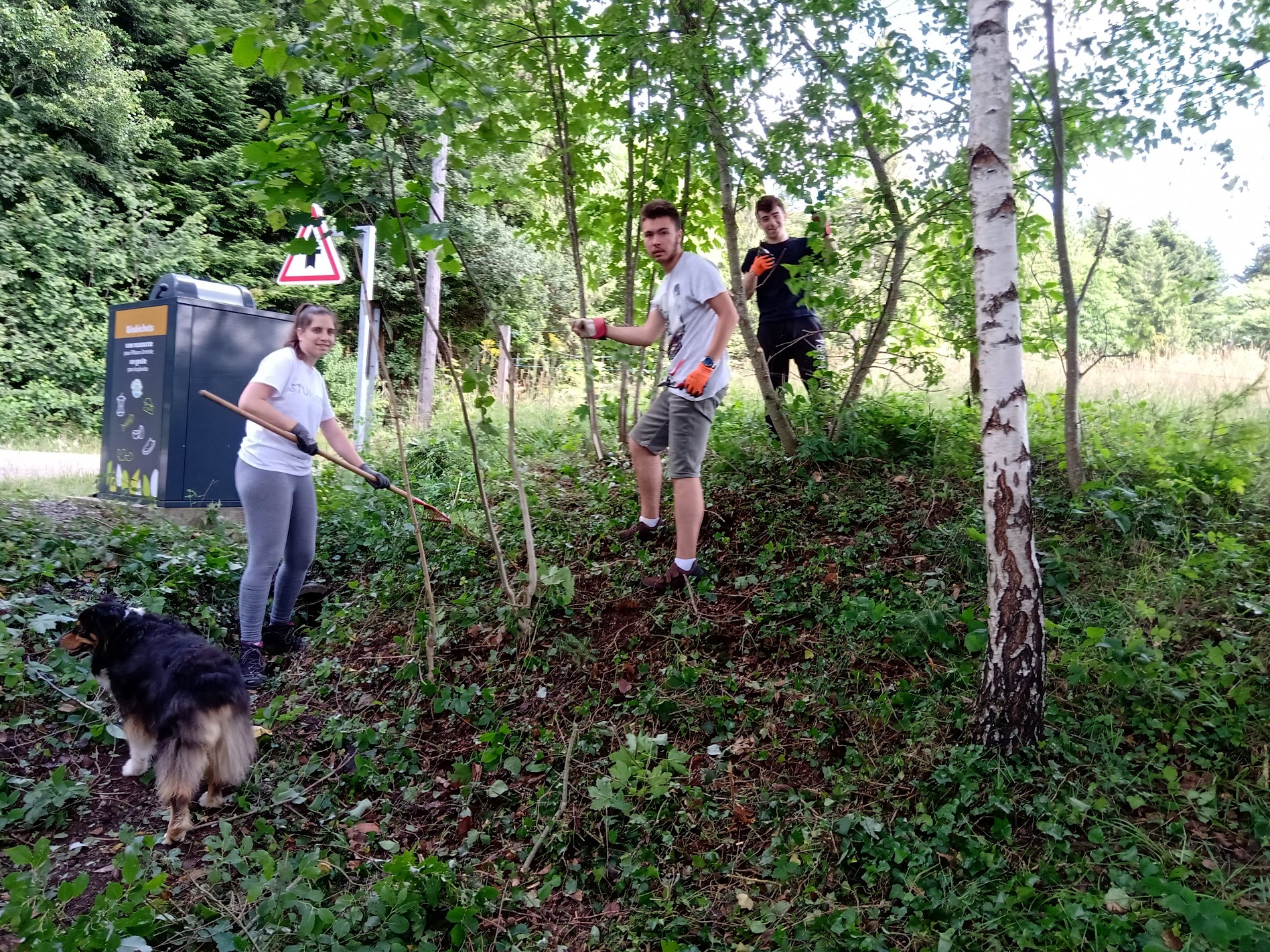 Ils sont les premiers à mettre les mains à la pâte sur le futur site d’ABC-Climont. Ils ont débroussaillé, coupé l’herbe, enlevé les genets. Ils ont poncé et peint les trois tables de pique-nique. Le tout sous le regard bienveillant de Roland Henry et son chien Jade, venus les accompagner avec leur savoir faire. Outre ses réponses aux questions techniques, il apporte des petites touches de sagesse autre: les noms des fleurs à laisser (millepertuis, prêle des champs, églantine…), gestion de la fourmilière découverte sous les ronces, plaidant pour une cohabitation interspécifiques pacifique!