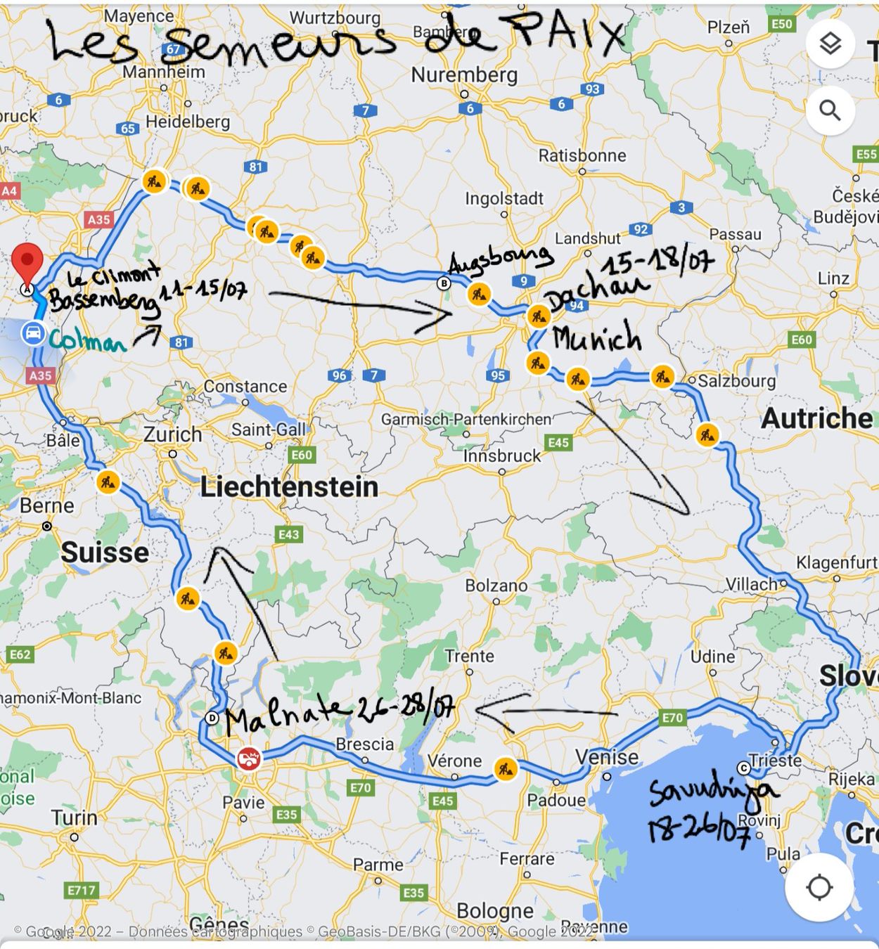 Ils faisait déjà nuit hier soir, quand ils ont étalé un grand drap blanc sur le terrain de basket du Climont pour y laisser la trace de leur mains et noms… Ce drap les accompagnera tout au long de leur voyage pour y récolter d’autres mains et noms, témoignages, espérances et histoires, qui parlent de notre désir commun de vivre dans un monde en paix.