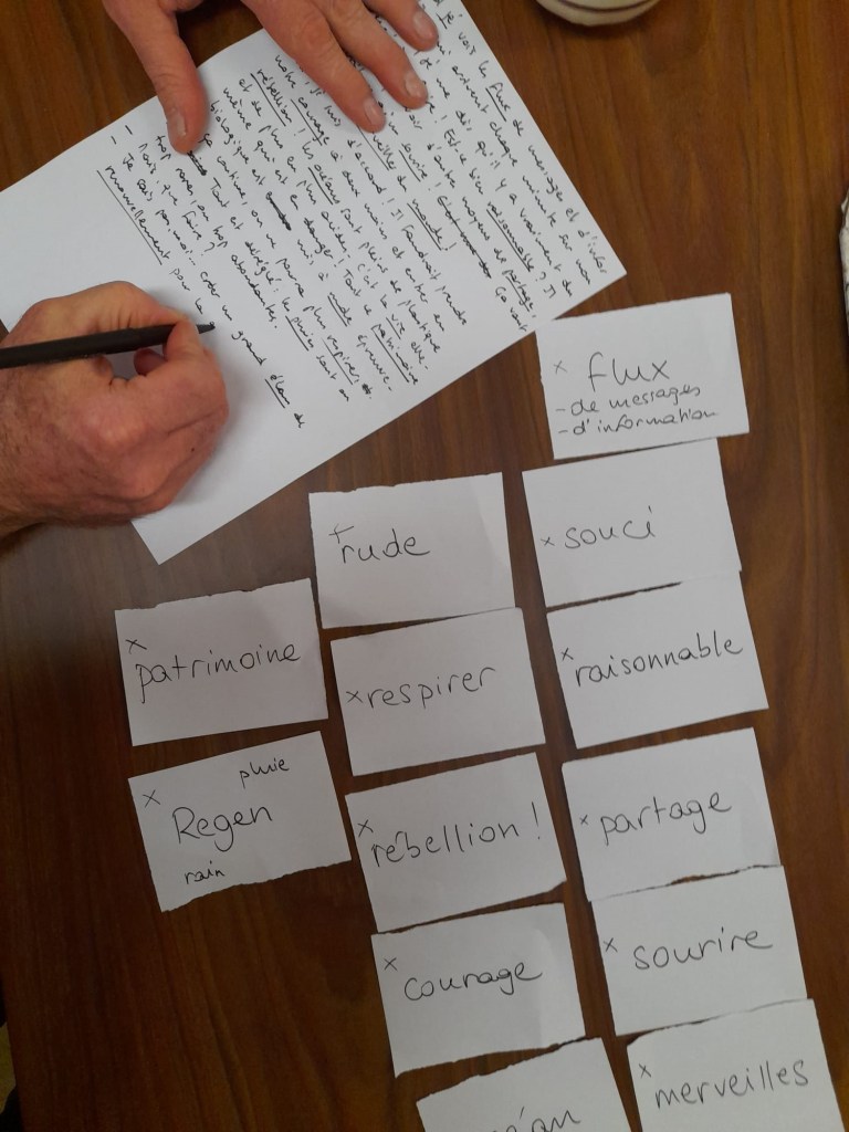 Les Mots pour la terre ont été envoyés jusqu’au 15 octobre. Le 16 octobre chaque atelier d’écriture a reçu 20 mots pour écrire un texte. Les textes seront postés sur les réseaux sociaux et le site internet :