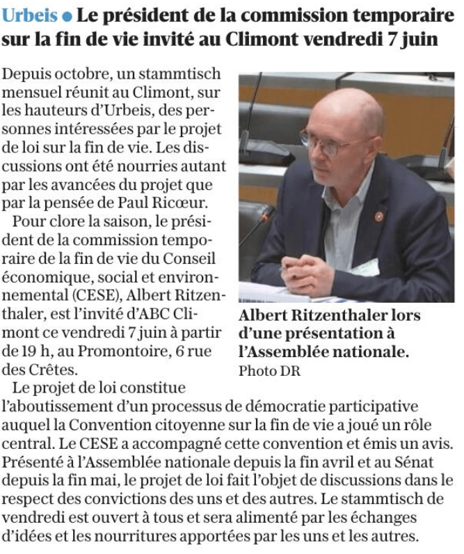 Pour notre dernier Stammtisch de la saison sur les questions autour de la vie et sa fin, nous aurons le grand plaisir d’accueillir Albert Ritzenthaler, le président de la commission temporaire Fin de vie.