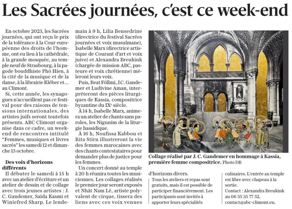 ABC-Climont propose en partenariat avec le festival Les Sacrées journées un week-end de rencontre interreligieuse « Femmes, musique et livres sacrés » le samedi 12 octobre et 13 octobre 2024 avec un concert à 20h au Temple du Climont.