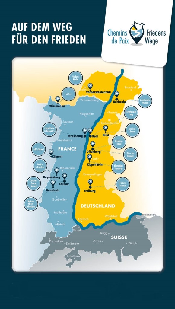L’Association Chemins de paix / Friedenswege soutient et met en réseau des lieux et des initiatives de paix des trois cotés du Rhin : en France, Allemagne et Suisse.