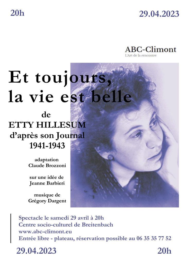 Le spectacle est proposé dans le cadre de la session sur d’Etty Hillesum – un itinéraire spirituel, animée par Cécilia Dutter du 28 au 30 avril au Climont.