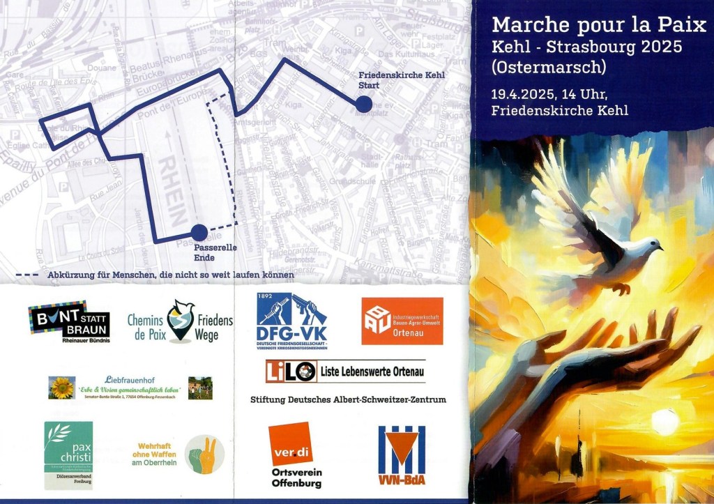 14h Départ de la marche devant la Friedenskirche sur la Place du Marché de Kehl – Pont de l’Europe – La chapelle de la Réconciliation – La Passerelle – La Mairie de Kehl