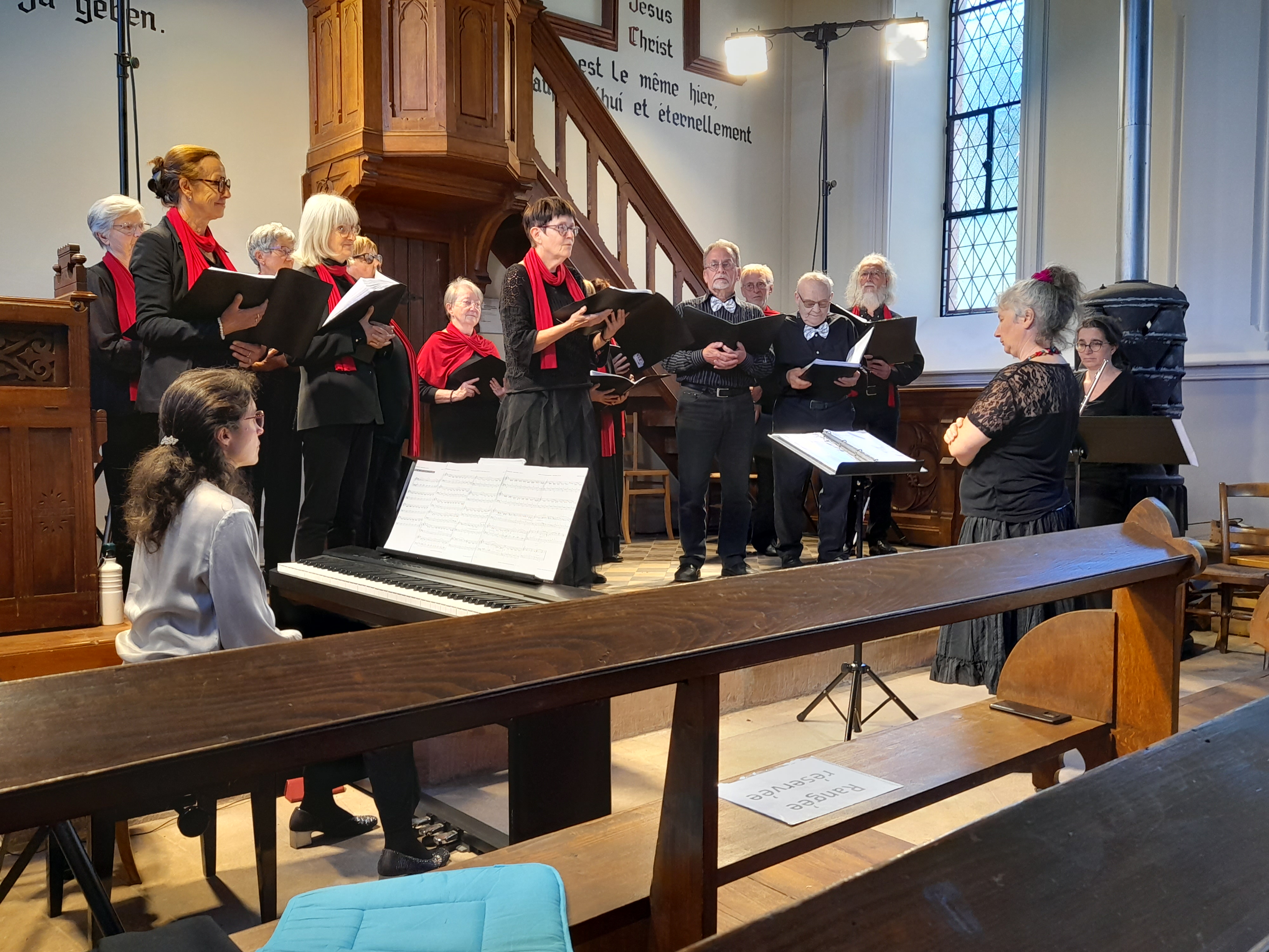 Catherine Cholley a repris la direction de la chorale depuis 4 ans, avec pour ambition d’ouvrir le chœur à toutes les personnes désireuses de chanter ensemble dans la bonne humeur, afin de répandre le bonheur du chant en commun. Elle aime bien se retourner pour faire chanter l’assemblée à la fin du concert pour les derniers morceaux !