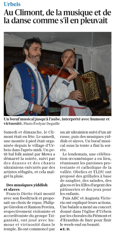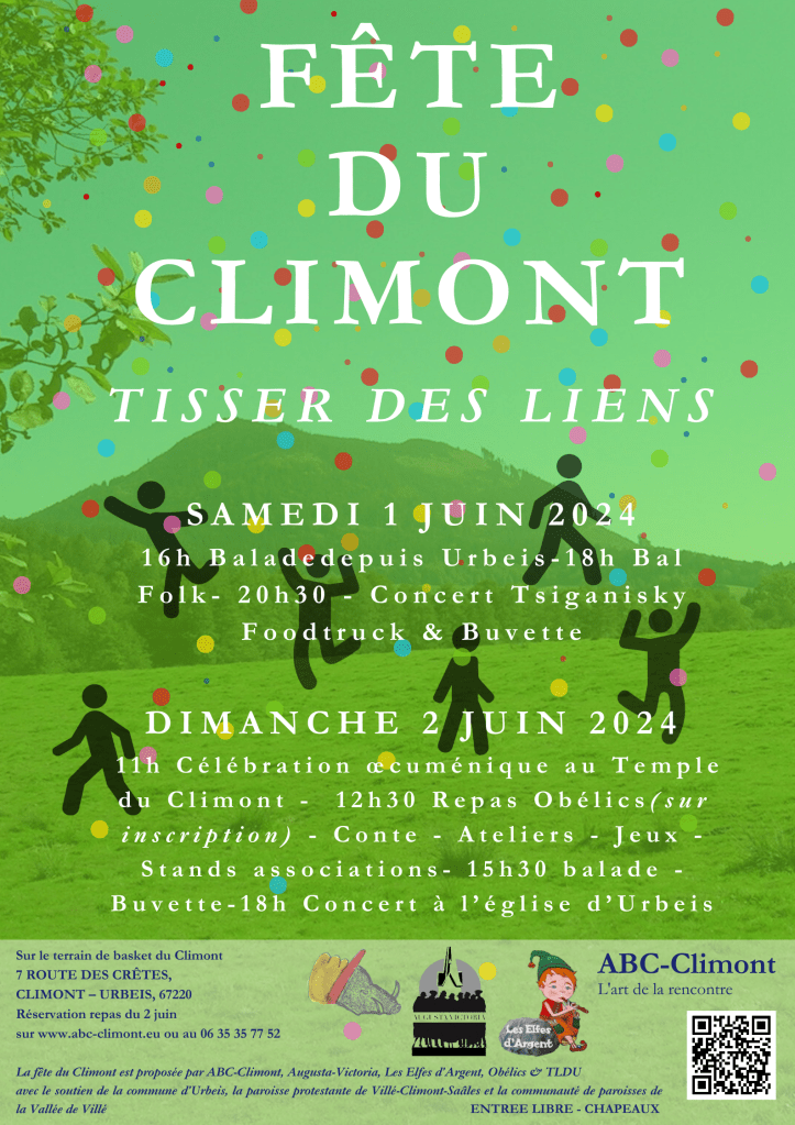 Tisser des liens! La deuxième édition de la fête du Climont a bien honoré son thème! Malgré la météo, et peut-être grâce à la météo nous avons dû improviser, se faire de la place sous les tentes pour mieux se retrouver autrement! Un grand merci à tout ceux et celles qui ont porté cette belle fête: à ABC-Climont, Augusta-Victoria, Les Elfes d’Argent, Obélics, TLDU, avec le soutien de la commune d’Urbeis, la paroisse protestante de Villé-Climont-Saâles et la communauté de paroisses de la Vallée de Villé.