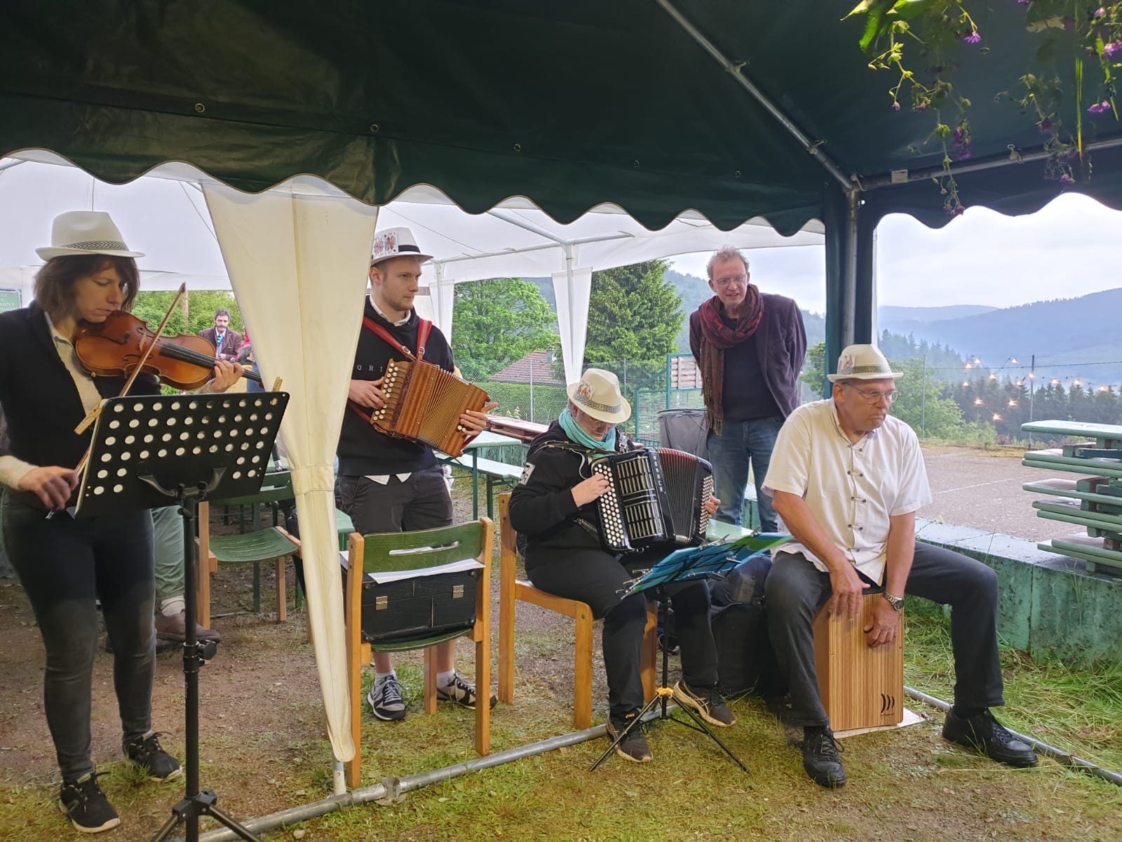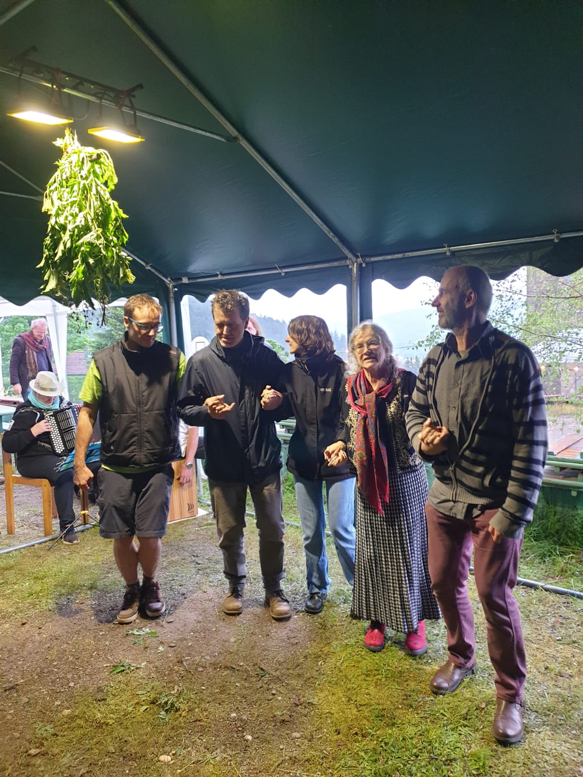 A 18h, la fête peut commencer avec le bal folk proposé par MOWA, qui ouvre la danse entre les gouttes! A l’accordéon: Quentin André & Anne Ostertag. Au violon: Edith Maurer. Et pour la percussion et la guitare: Jean-François Wolff. Agnès Netzer-Solau et Jean-Luc Gasser nous montrent comment poser nos pieds!