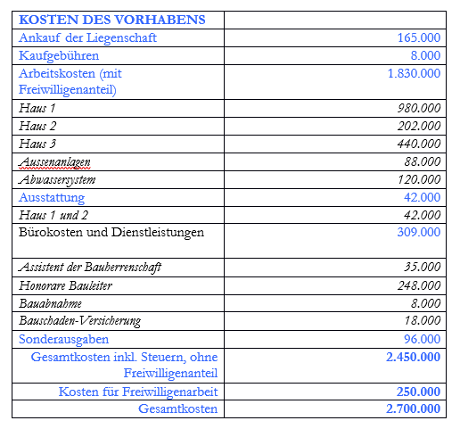 Mit dem Ziel der Renovierungsarbeiten von Haus 3 und der noch ausstehenden Aussenarbeiten (550.000 € inkl. Bürokosten und Dienstleistungen des Bauleiters und des Assistenten der Bauherrenschaft):