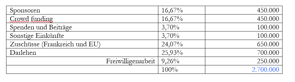 - Einwerben von Sponsorengeldern, Crowd Funding, Spenden und Beiträgen (800.000 €)